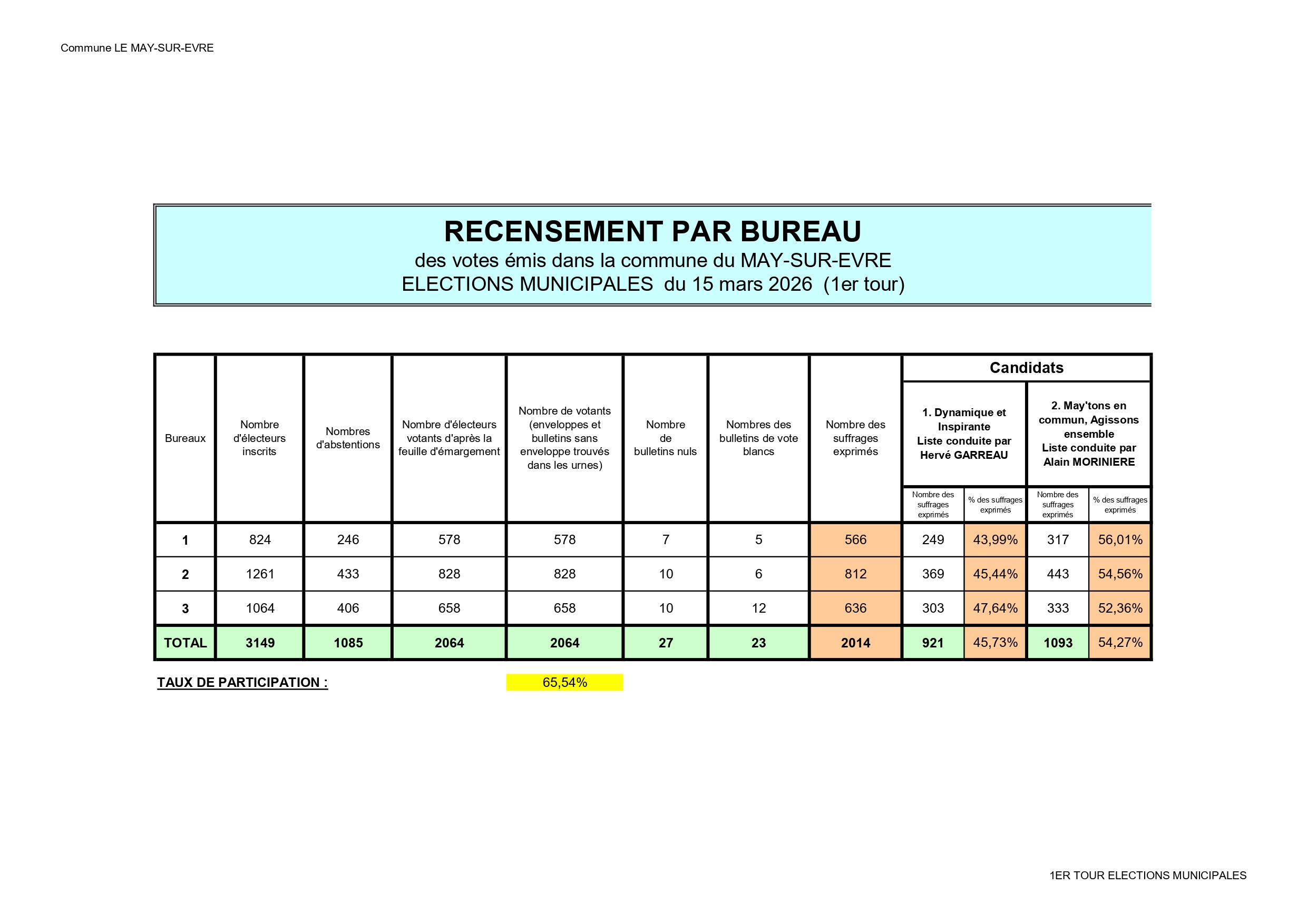 À l’issue des élections municipales et avec un taux de participation de 65,54%, la liste « May'tons en commun, agissons ensemble », conduite par M. Alain Morinière, a remporté le scrutin avec plus de 54 % des voix. Conformément à la procédure, le Conseil municipal nouvellement élu sera installé le samedi 21 mars à 11h. Lors de cette séance, les conseillers municipaux procéderont à l’élection du Maire ainsi que des Adjoints. Cette séance d’installation constitue la première réunion officielle du nouveau conseil municipal. La commune remercie l’ensemble des électrices et électeurs pour leur participation à ce temps fort de la vie démocratique locale.